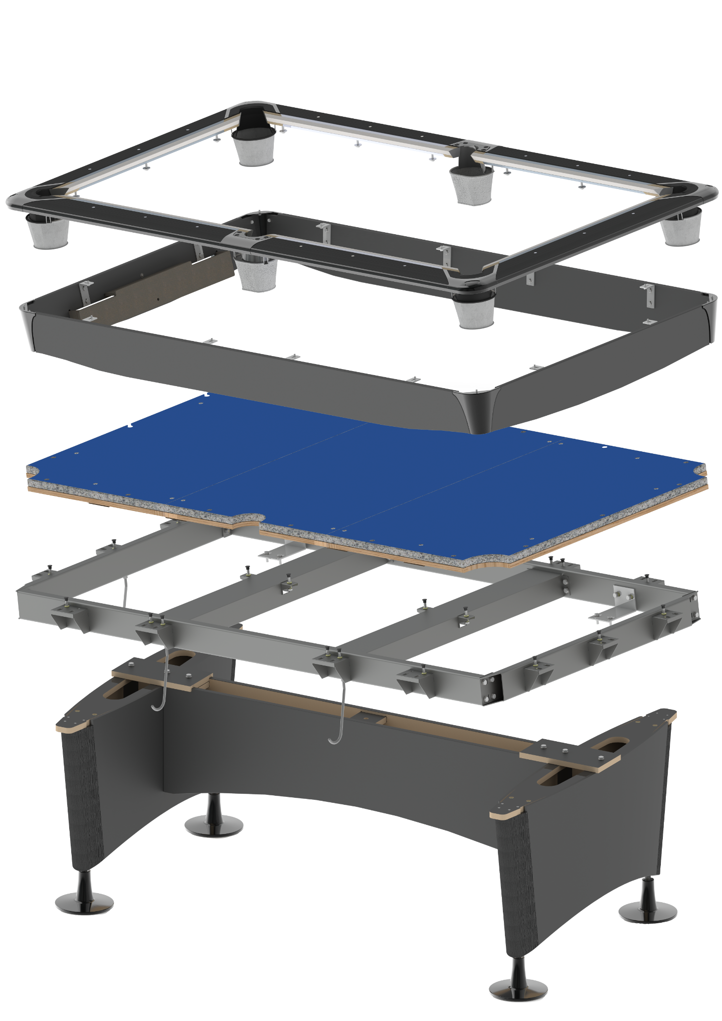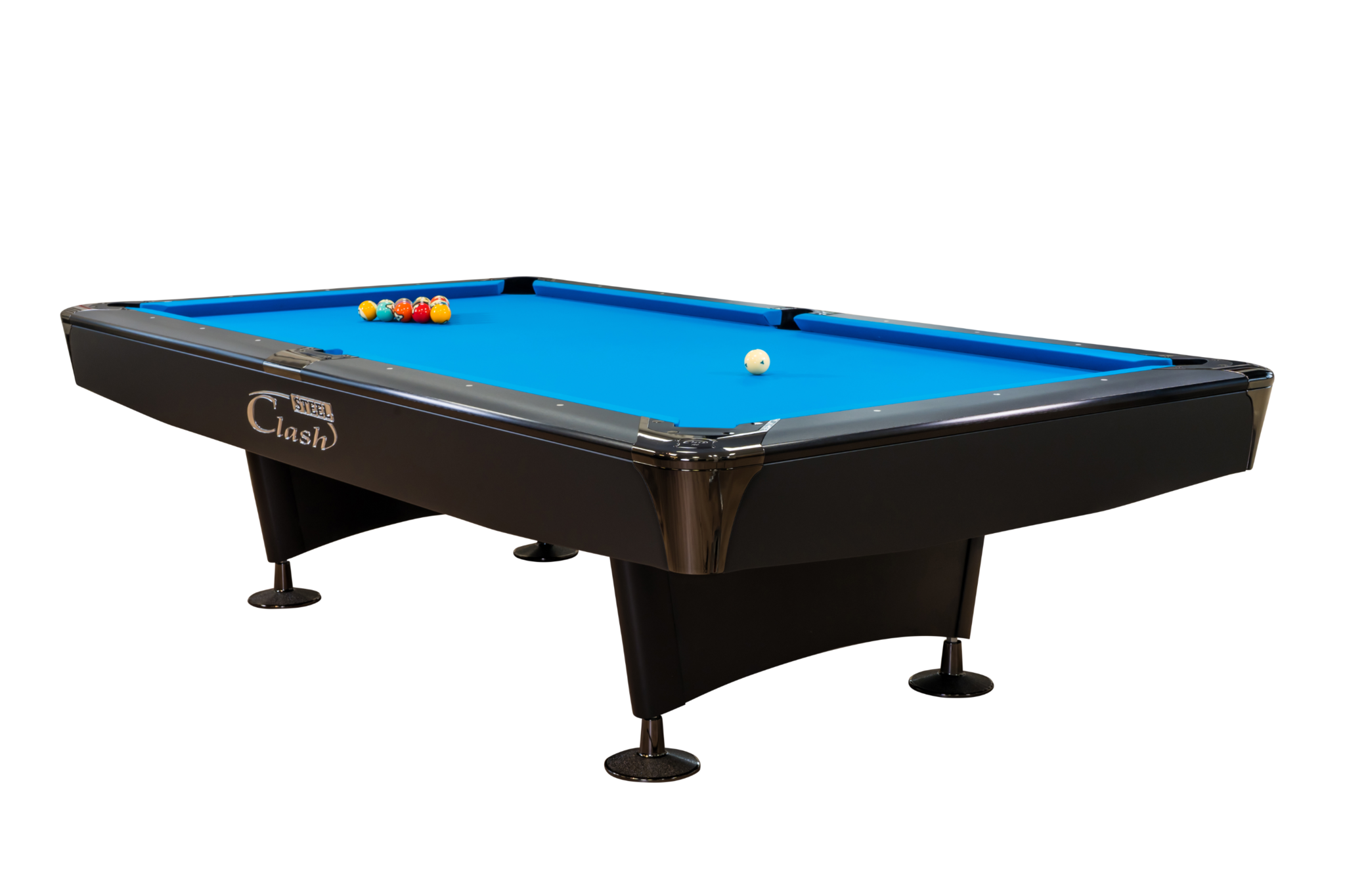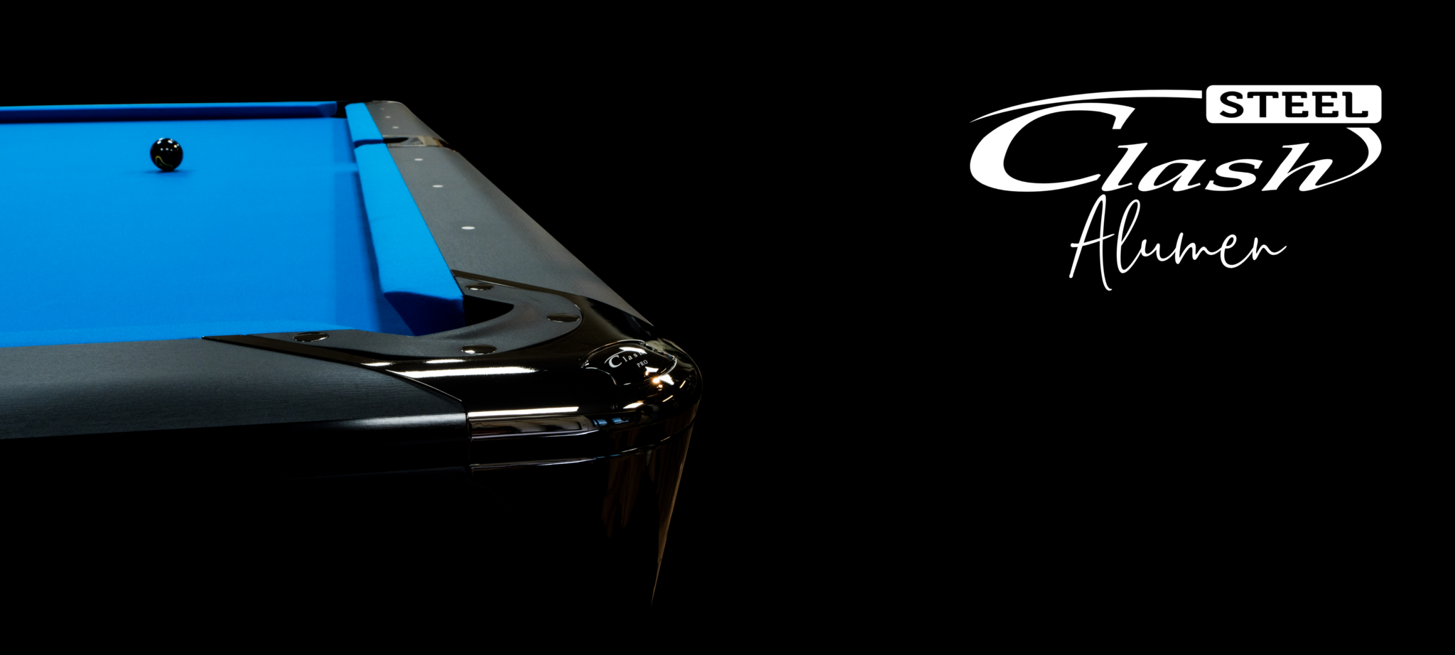 The Clash Steel Pro Alumen is onze top of the line pooltafel met vele innovaties zoals nieuw ontwikkelde aluminium banden afgewerkt met soft touch vinyl en nieuw ontwikkelde stalen frame. Verder in een tijdloos design met afwerking van de metalen delen in space black voor een extra luxe uitstraling.